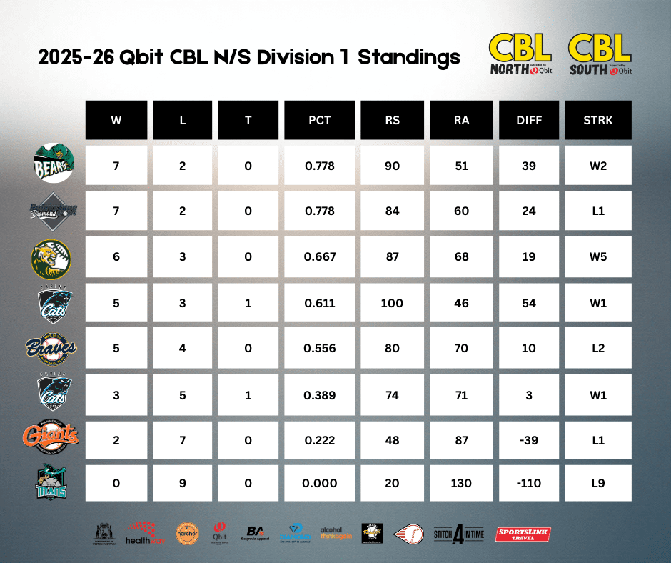 The 2025-26 Qbit CBL N/S Division 1 season is in full swing as Balcatta, Roleystone, Willetton, and Carine lead the standings after nine weeks.