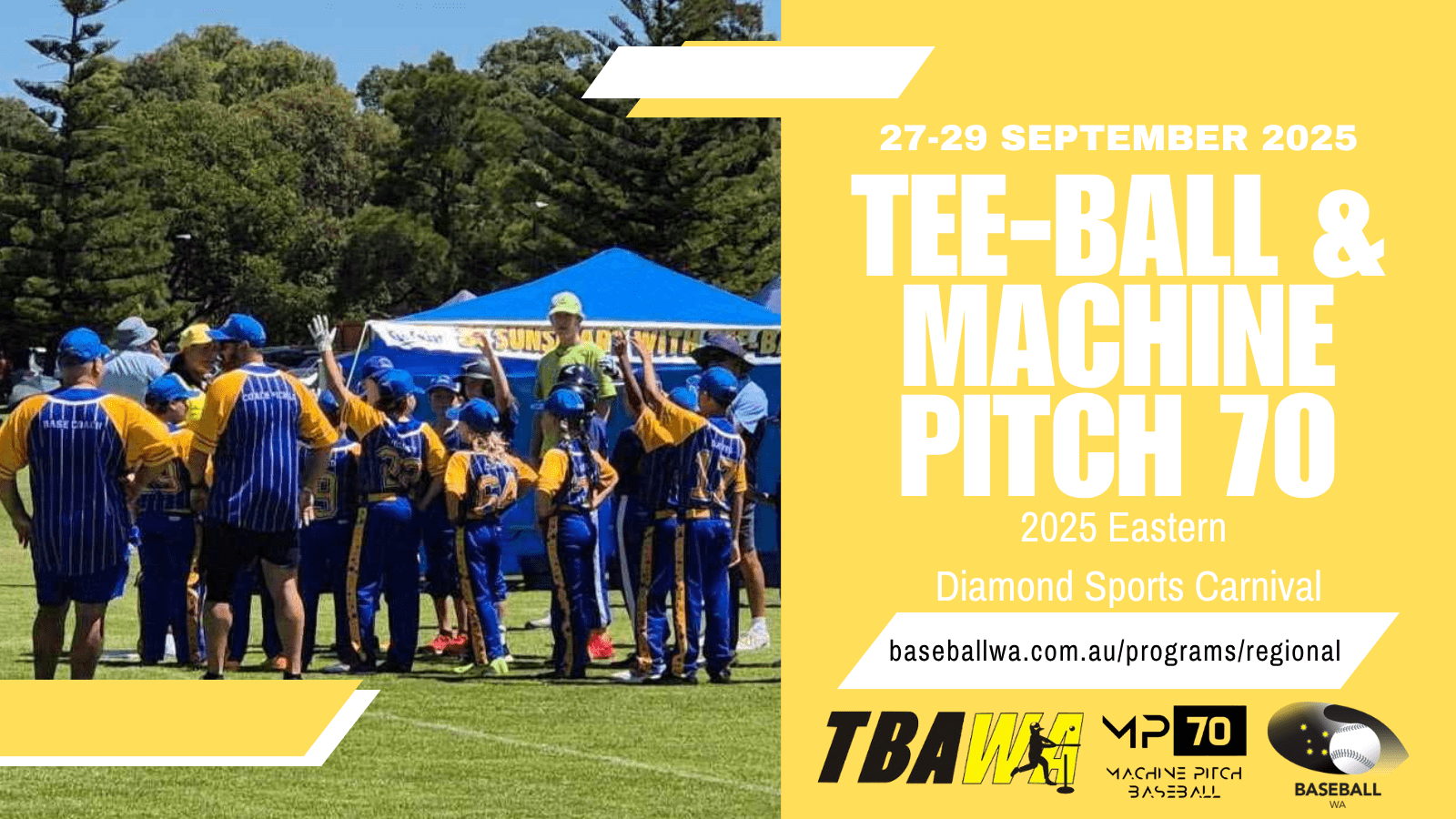Baseball WA is pleased to open registration for Tee-Ball and Machine Pitch 70 at the 2025 Eastern Diamond Sports Carnival, which will be held at the Oasis Playing Fields (Kalgoorlie-Boulder) from 27-29 September.