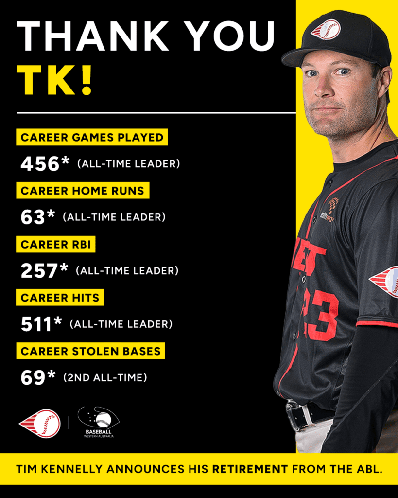 PERTH — Western Australian baseball icon Tim Kennelly will retire from the Australian Baseball League at the conclusion of the 2025–26 season, closing the chapter on one of the most significant careers in WA and Australian baseball history.