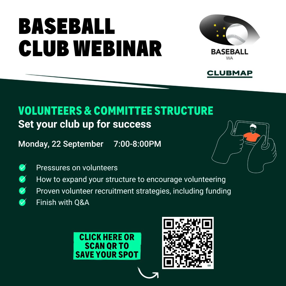Baseball WA and CLUBMAP are teaming up for a Baseball Club Webinar: Volunteers & Committee Structure on Monday 22 September from 7-8pm.
