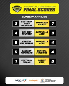 Wanneroo Giants overcame an early deficit to beat Southern Hills Warriors 7-2. Tyson C sparked the comeback with a three-run single in the third inning. Levi C was strong on the mound, allowing just one hit across six innings with six strikeouts. The Giants tallied 13 hits, with Xavier K, Jacob H, Miller J, Kaiden K and Tyler N all collecting two apiece. Tyson finished with two RBIs. Southern Hills Warriors scored two runs early but couldn’t add more. Andrew G led the Warriors with one hit.